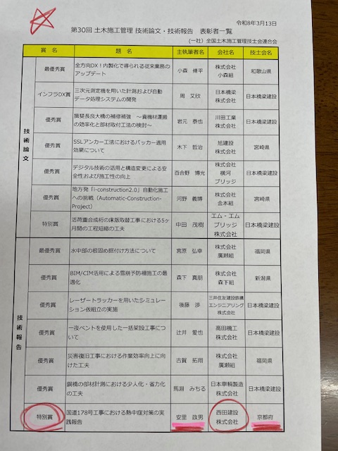 (一社)全国土木施工管理技士会連合会の「第30回土木施工管理技術論文・技術報告」に応募した結果、