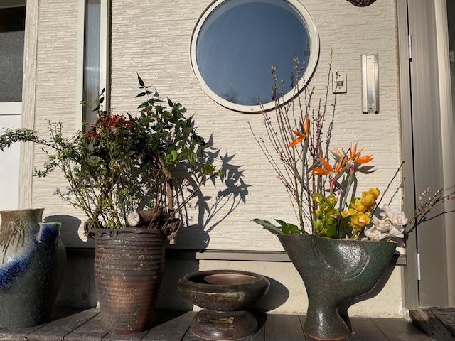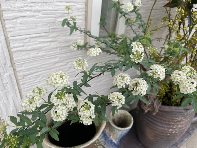 玄関先の花も咲いて良いのか戸惑っているようです。