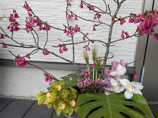 自宅前に、生けた桜の枝。
